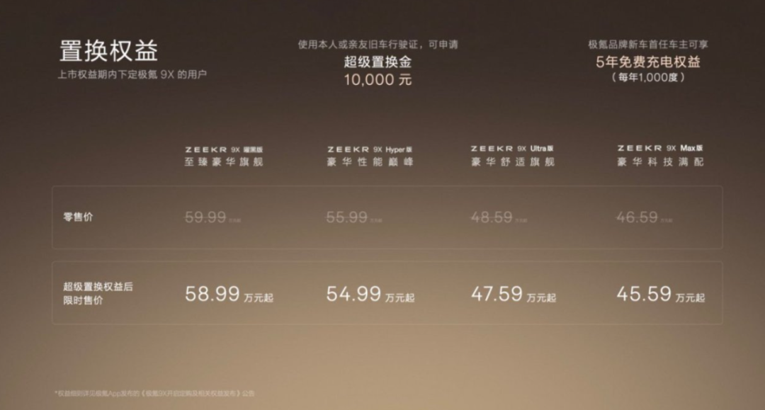 9月29日,极氪官方宣布旗舰SUV-9X正式上市,共推出Max、Ultra、Hyper、曜黑版四款车型,官方售价46.59万-59.99万元,搭配置换权益限时售价为45.59万-58.99万元。