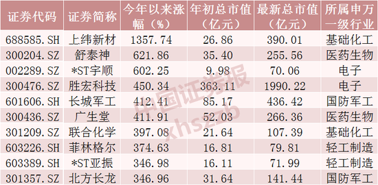 截至8月15日,今年以来涨幅最大的十只个股分别为上纬新材、舒泰神、*ST宇顺、胜宏科技、长城军工、广生堂、联合化学、菲林格尔、*ST亚振、北方长龙,涨幅均超340%。